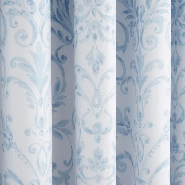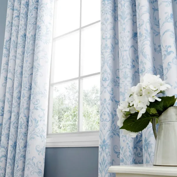 Elegant 100% cotton eyelet curtains with a timeless blue damask design and blackout lining for optimal light control. The smooth eyelet header allows effortless hanging, adding sophistication, comfort, and a calming, airy charm to any bedroom.