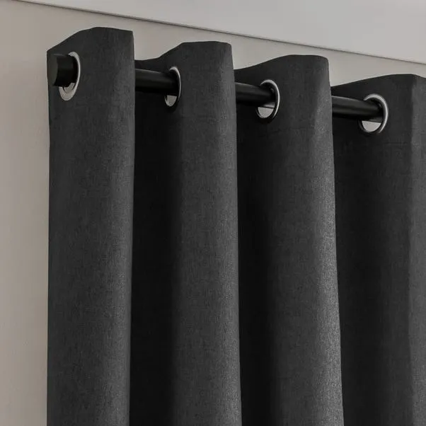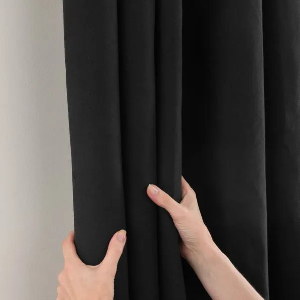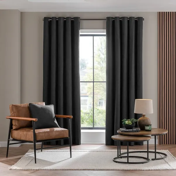 Pair of blackout curtains in soft brushed Luna fabric with eyelet header. Thermal properties regulate room temperature while blocking light. Ideal for bedrooms or living rooms, offering all-season comfort, privacy, and a sophisticated, elegant finish.