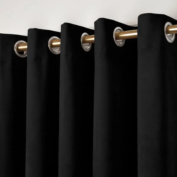 Pair of blackout curtains in soft velvet with eyelet header. Fully lined panels block sunlight and provide privacy. Ideal for bedrooms or living rooms, these elegant curtains add a fresh, airy, and refined touch to any interior décor.