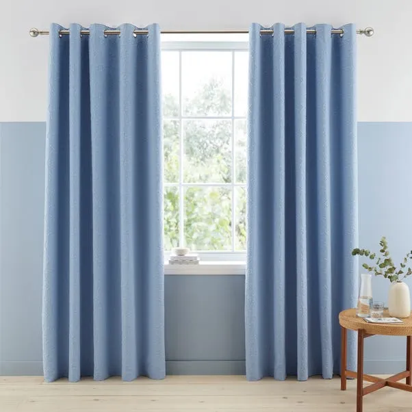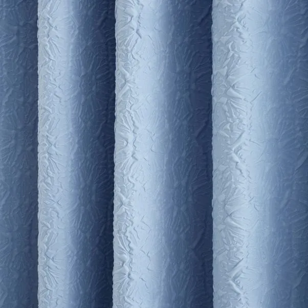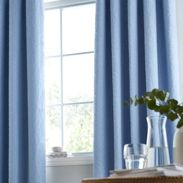 Stylish blue patterned curtains crafted from soft printed polyester with blackout lining for enhanced privacy and light control. Designed with a heat-set textured finish for added depth and durability. Ideal for bringing elegance and everyday practicality to any room.
