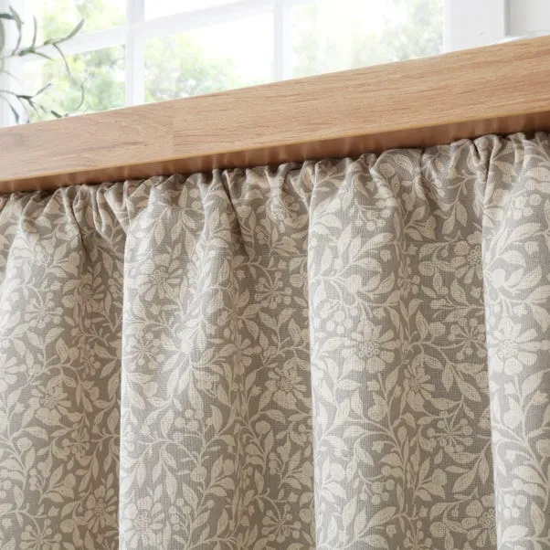 Light grey undercounter curtain with Chartwell floral pattern, made from a cotton-linen blend. Unlined with a simple slot top header, it adds relaxed country charm to kitchens while concealing storage spaces with effortless style and easy installation.