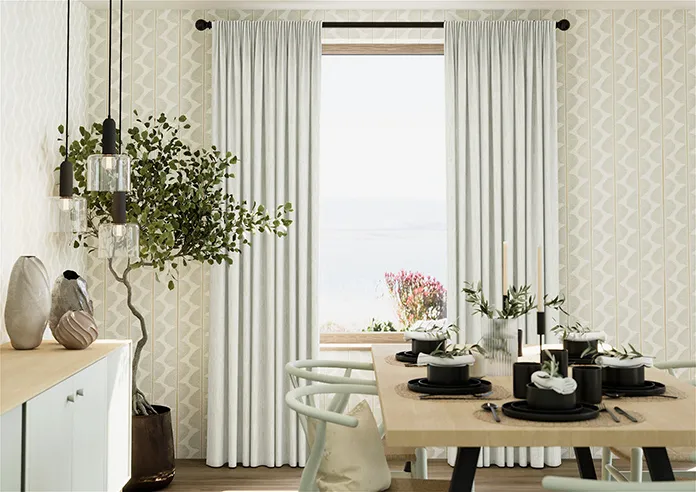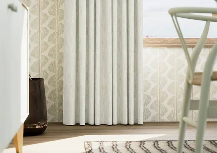 Made-to-measure Wave Curtains in Culross speckled white blackout polyester, offering excellent light control with a lightweight contemporary drape. Unlined for a sleek finish, with pattern-matched pairs to achieve a clean, seamless and perfectly tailored window look.