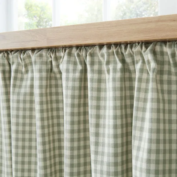 Charming sage green gingham undercounter curtain in 100% cotton. Unlined with a slot top header for easy hanging, it adds a fresh country feel to kitchens while concealing storage spaces with timeless style and effortless elegance.