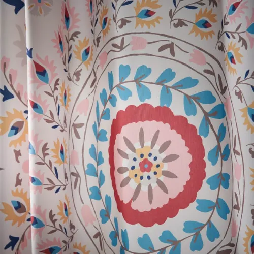 Brighten your bathroom with the Hani Floral Shower Curtain featuring a vibrant floral design.