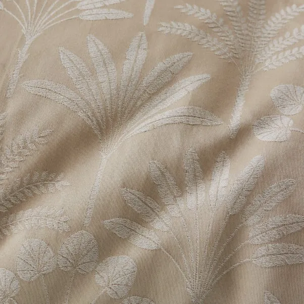 Elegant blackout curtains with a textured jacquard palm design and classic champagne and ivory tones. Pencil pleat header ensures a tailored drape, while the blackout lining enhances privacy and light control, creating a refined and comfortable interior atmosphere.