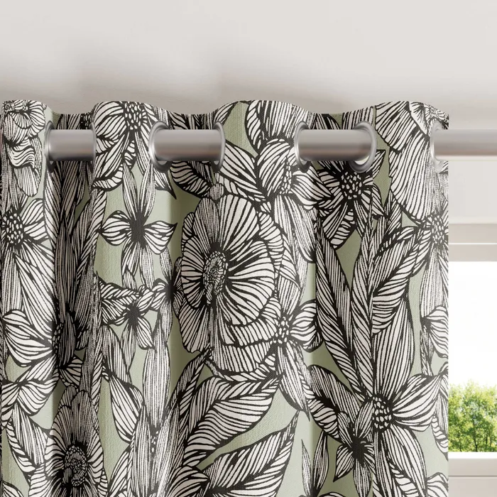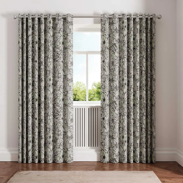 Ted Baker Vietnm Lined Curtains in Sage bring bold floral style to your windows. Large blooms in monochrome sit on a sage green ground for a strong, modern look. Silver eyelets make hanging easy; full lining gives a neat drape. Part of our living room curtains range. Six sizes to choose from.