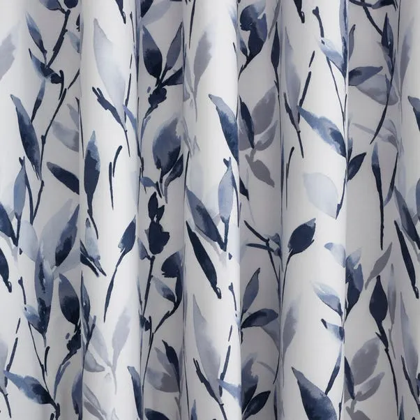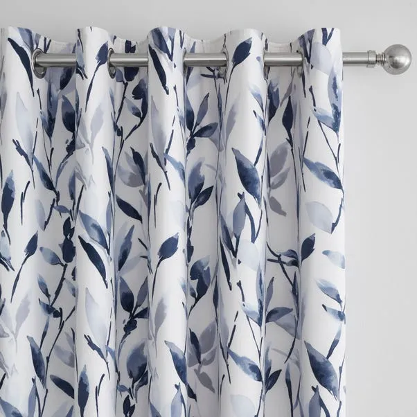 Tranquil eyelet curtains with polycotton fabric and a leafy design. The blackout lining reduces sunlight and enhances privacy, while the eyelet header ensures smooth hanging on a pole, creating a serene, stylish, and comfortable atmosphere in any room.